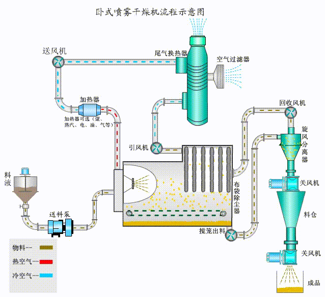 卧式喷雾干燥机特有的尾气热能回收余热系统可以显著地减低能源消耗,提高干燥机的热量综和利用率,比立式干燥机节约能耗30%。而对于立式干燥机没有人呢过回收系统,粉末风管、旋风分离器、布袋除尘器等。散热便面多。有些设备没有保温层,从而就大大增加了热量损失。根据开云kaiyun网页版官网多年的实践经验,对于没有热能回收系统及散热大的立式干燥机,它的水份蒸发单位热量消耗约为1300千卡/公斤水,那么同样对于1000公斤/小时水份蒸发量的干燥机来说,立式干燥机每小时将多付出热量消耗约为43000千卡。(每小时需要多付出86公斤的5000千卡标准煤或50立方的天然气,燃气的标准值是8500千卡/立方米)