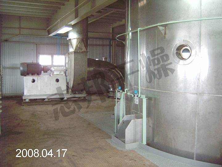 2、采用并流型喷雾干燥形式能使液滴与热风同方向流动,虽然热风的温度较高,但由于热风进入干燥室内与喷雾液滴接触,室内温度急降,而物料的湿球温度基本不变,因此也适宜于热敏性物料干燥。
